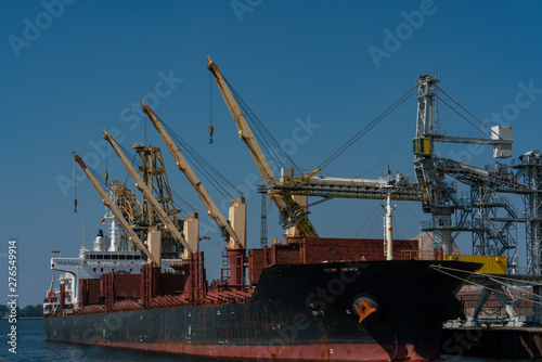 yellow dockside cranes and a black ship at the industrial harbour in Rostock