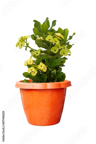 Yellow Euphorbia milli or Crown of Thorns flower in brown plastic pot isolated on white background included clipping path.