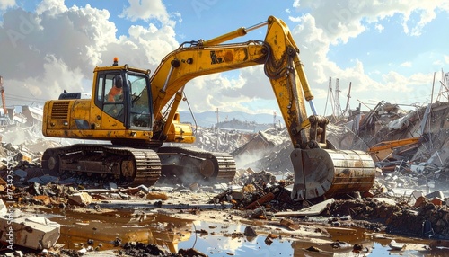 Yellow excavator clearing rubble at active demolition site with dust, broken concrete, and exposed structures—symbolizing force, transition, and the industrial choreography of destruction and renewal.
