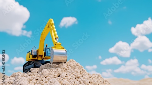Yellow Excavator Digging Sand Under Blue Sky with Clouds