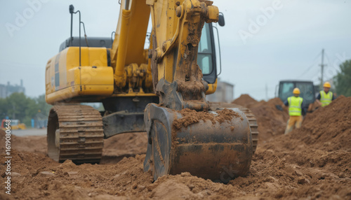 Yellow excavator digs soil at construction site. Heavy machinery operates, earthmoving, excavation. Workers in safety gear coordinate project progress. Industrial development, infrastructure build,