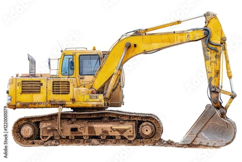 Yellow excavator on tracks, used for construction and earthmoving tasks. isolated on white background