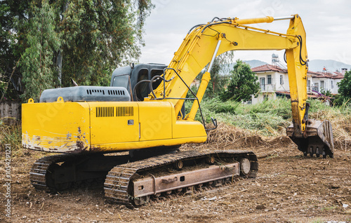 Yellow excavator parked on a construction site with vegetation and houses in the background, ready for digging operations.