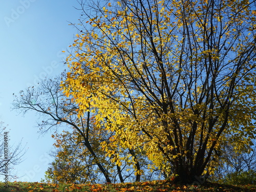 Yellow fall leaves on trees and fallen on grass in sunny autumn day with blue sky. Colorful autumn nature landscape.