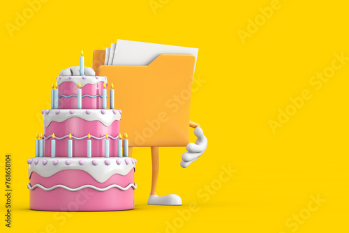 Yellow File Folder Icon Cartoon Person Character Mascot with Birthday Cartoon Dessert Tiered Cake and Candles. 3d Rendering