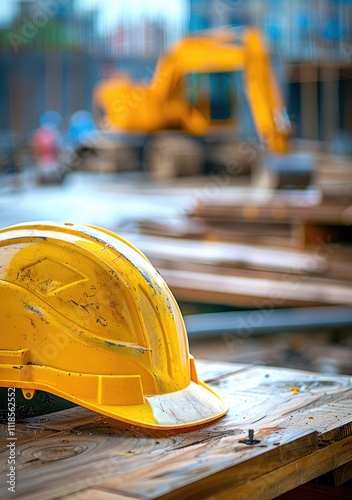 Yellow hard safety helmet hat for safety project of workman as engineer or worker, on concrete floor in construction site