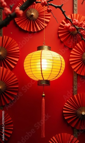 red, lantern, tree branch, decor, hanging, tassel, light, indoor, chinese, nobody