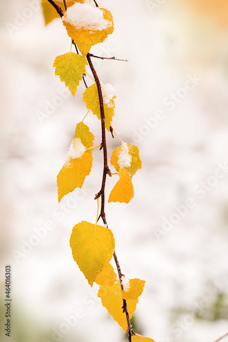 Yellow leaves of birch tree covered first snow. Winter or late autumn scene, nature frozen leaf, it is snowing