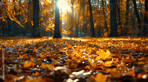 Yellow leaves on the ground in an autumn park. Carpet of autumn leaves on the grass. Warm autumn sunny park.