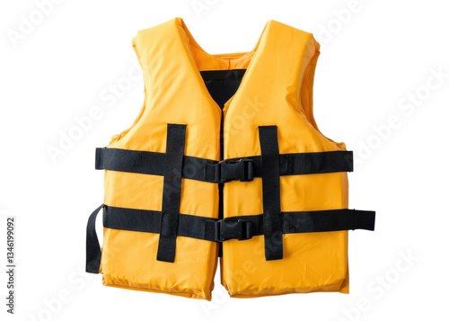 Yellow life jacket with black straps on a transparent background. Concept of safety, boating, and water sports.