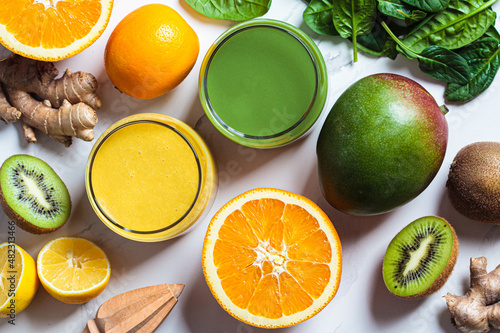 Yellow mango smoothie and green spinach smoothie with ingredients on white background. Detox drinks concept.