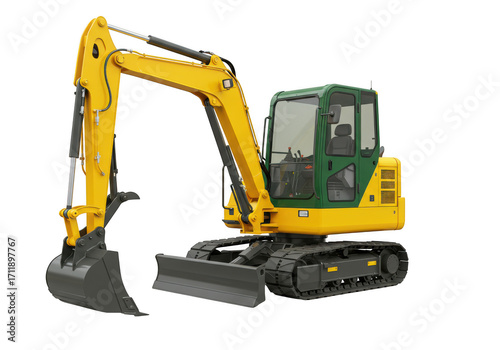 Yellow mini excavator digging machine ready for construction work isolated isolated on transparent background
