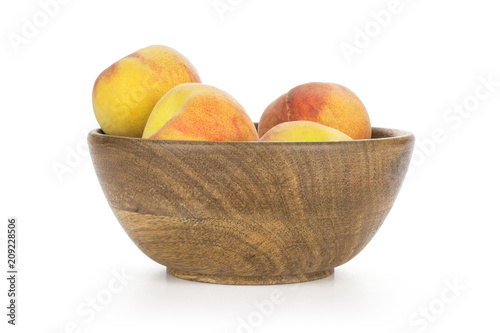 Yellow peaches in a wooden bowl isolated on white background.