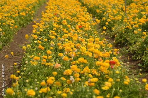 Yellow ranunculus rows and red buttercumps. Flower fields. close up