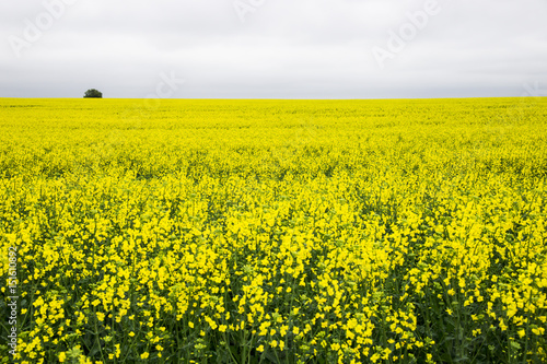 Yellow rape field and gray cloudy sky
