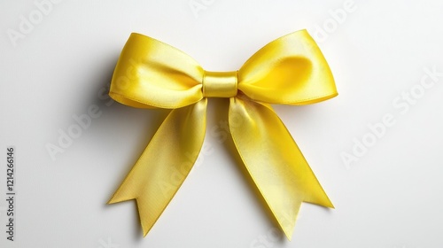 Yellow satin ribbon bow on white background; gift wrapping, decoration