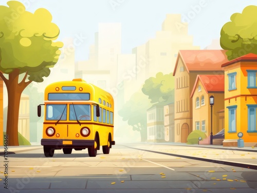 Yellow School Bus Driving Down Street, Back to school theme illustration