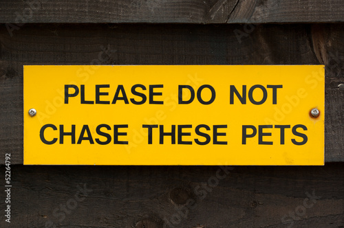 to do, non, chase, the, pet, pet, animal, animal, zoo, sanctuary, yellow, warn, warning, safety, notice, signs, signage, plate, on, wood, wooden, slat, building, house, hut, shed, wall, wall, care, health, danger, dangerous, law, law, legal, rule, rule, regulation, regulation, please, kind, kindly, treat, treatment, mistreat, mistreatment, cruel, cruelty, harm