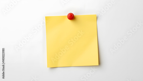 Yellow sticky post it note with red pushpin isolated on white background