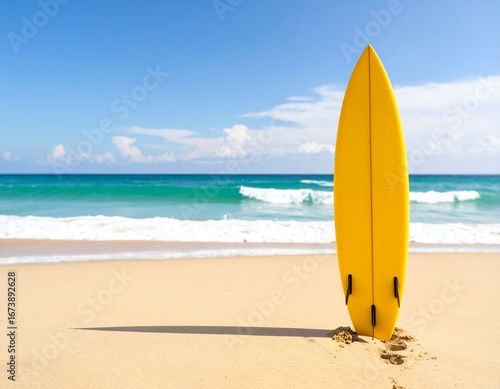 surfboard, beach, ocean, sea, summer, coastline, sandbeach, vacation, holiday, travel, surfing, surf, water sport, wave, horizon, clear sky, blue skies, seascape, tropical, nature, adventure, beach vacation, exotic beach, tropical beach, ocean view, seacoast, paradise, sunny day, leisure, freedom, sport, extreme sport, travel destination, summer getaway, beach vacation