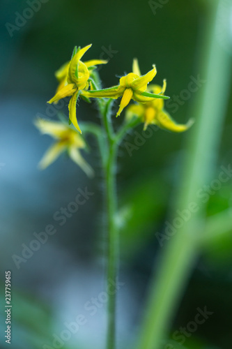 Yellow Tomato flowers and leaves in blurred garden, Close up and Marco shot