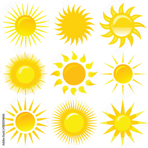 Yellow Vector Sun Icons with Glossy Rays and Sparkles Transparent Background for Summer Designs