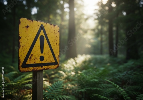Yellow Warning Sign with Exclamation Mark in a Misty Forest
