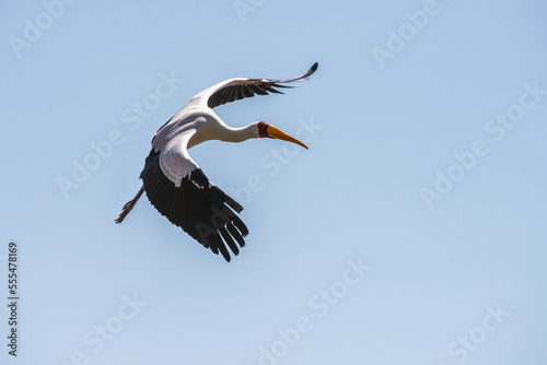 Yellow-billed Stork (Mycteria ibis) in flight in a blue sky at Lake Manyara National Park; Tanzania