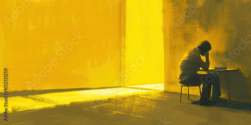 Yellow-Fringed Depression: A hunched figure sitting alone in a desk-free space, surrounded by shadows that cast a yellowish hue over the room.