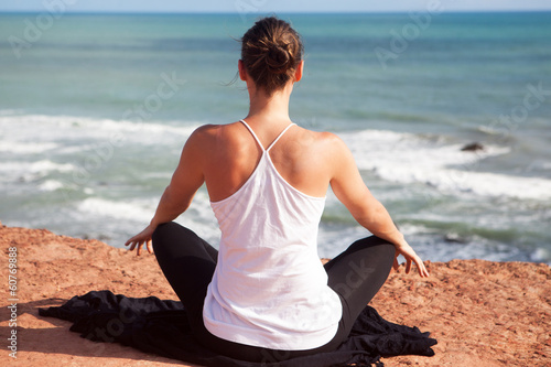 yoga, sitting, cross-legged, woman, beach, sea, cliff, cliff, panorama, summer, sport, sunset, backview, back, meditation, landscape, meditate, relax, health, stone, stretching, thinks, holiday, sun, red, outdoors