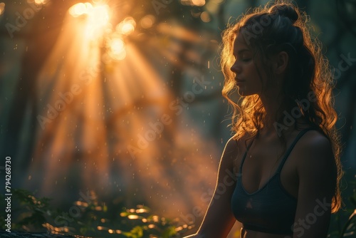 Yoga meditation with sun rays in woodland