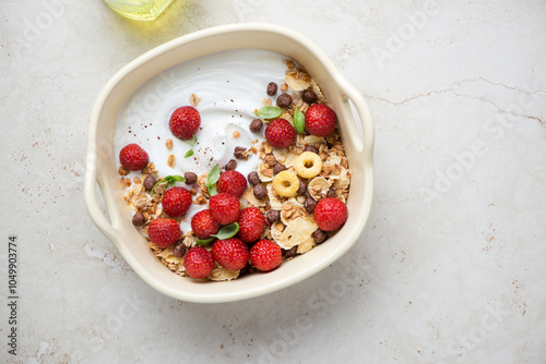 Yogurt bowl with fresh strawberry, granola and flakes, top view on a light-beige stone background, horizontal shot with space