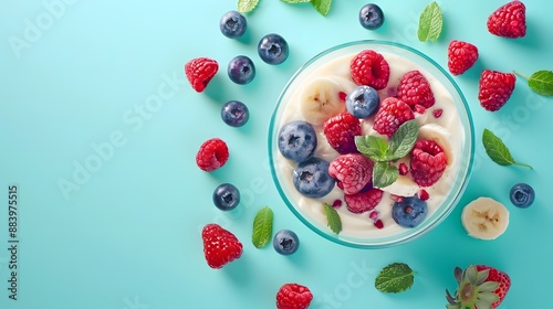 Yogurt with Berries, Banana and Mint on Blue Background.