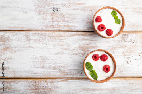 yogurt, yogurt, copy space, raspberry, background, berry, breakfast, ceramic, clay, closeup, cooking, cream, cup, decorated, delicious, dessert, diet, dinner, energy, fitness, food, fresh, fruit, green, health, ingredient, leaf, meal, milk, mint, natural, nourishment, organic, protein, raw, smoothie, snack, topview, vegetarian, white, wooden