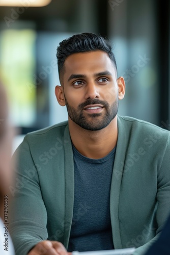 male, young, adult, office, setting, asian, beard, smile, confident, modern, professional, business, casual attire, meeting, discussion, attire, focused, corporate, indoor, workplace, intelligent, expression, thoughtful, short, contemporary, environment, interaction, photogenic, person, personality, serious, stylish, hair, pose, job, career, men at work, employee, formal, talk, conversation