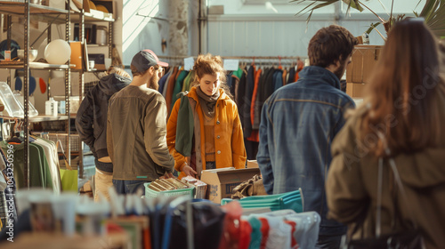 Young adults exploring a vintage thrift store filled with clothing and unique items on a sunny day