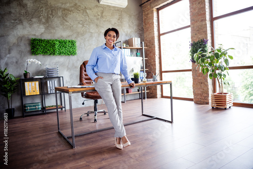 Young African American businesswoman standing confidently in stylish office with modern decor and ample natural light