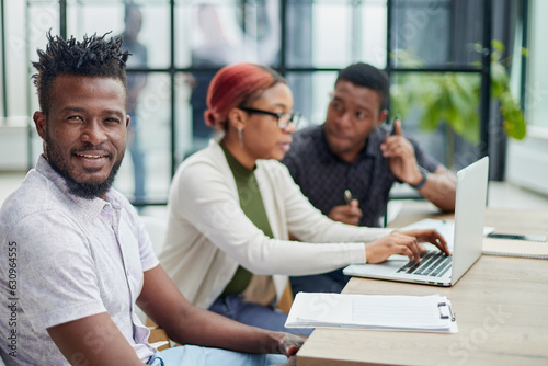 young African American man posing for the camera while sitting at a table in front of his colleagues