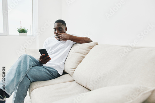 african, american, man, smartphone, leisure, home, relaxation, casual attire, sofa, comfort, expression, modern, lifestyle, technology, indoor, light, contemporary, joy, calmness, sitting, colours, happiness, everyday, simplicity, cosy, serenity, day, youth, communication, social, screen, texting, personal, modernity, bright, atmosphere, enjoyment, casual clothes, digital, male, living room, peace