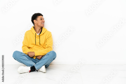 Young African American man sitting on the floor isolated on white background laughing in lateral position