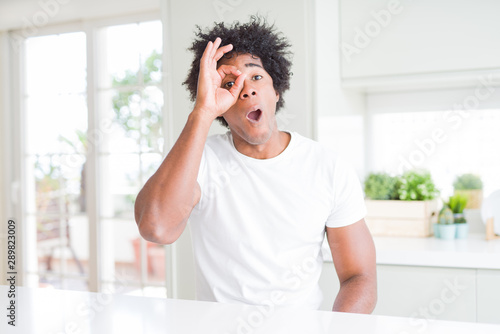 afro, black, american, young, adult, african, man, curly, portrait, background, home, house, sitting, white, table, t-shirt, casual attire, window, sunny day, sunlight, looking, through, ok, finger, eye, happy, gesture, fun, expression, signs, positive, person, finger, hand, cheerful, humor, view, doing, look, happiness, vision, approve, surprise, face, confident, shocked, shock, wow, amazed, unbelieving