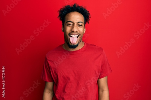Young african american man with beard wearing casual red t shirt sticking tongue out happy with funny expression. emotion concept.
