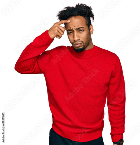 Young african american man with beard wearing casual winter sweater pointing unhappy to pimple on forehead, ugly infection of blackhead. acne and skin problem