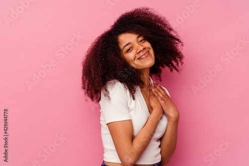 Young african american woman isolated on pink background has friendly expression, pressing palm to chest. Love concept.