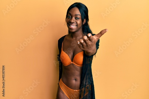 Young african american woman wearing lingerie smiling friendly offering handshake as greeting and welcoming. successful business.