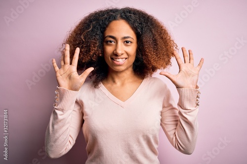 Young african american woman with afro hair wearing casual sweater over pink background showing and pointing up with fingers number ten while smiling confident and happy.