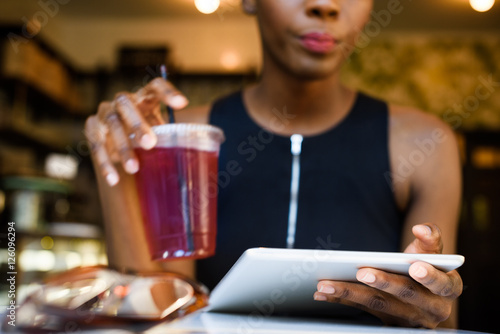 businesswoman, people, boss, female, lady, fashion, serious, contraption, work, businessperson, successful, executive, dynamic, tied-up, rebellious, activist, lifestyle, independent, pretty, african, black, international, lunch, cafes, table, tablet, working, young, drink, casual attire, copy space, concentration, wireless technology, hand
