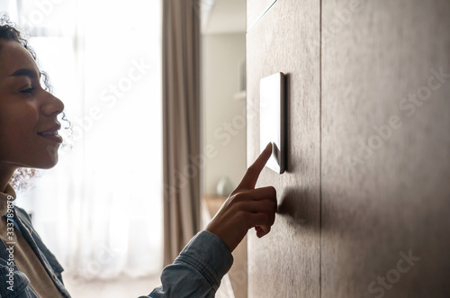 Young african woman using smart home touch screen ai technology connected appliances device on wall monitoring energy security heating system digital control in apartment. Smart home concept. Closeup