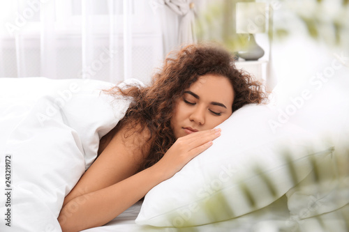 Young African-American woman sleeping on soft pillow at home. Bedtime