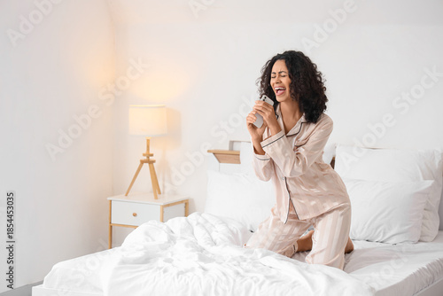 Young African-American woman with mobile phone singing in hotel room